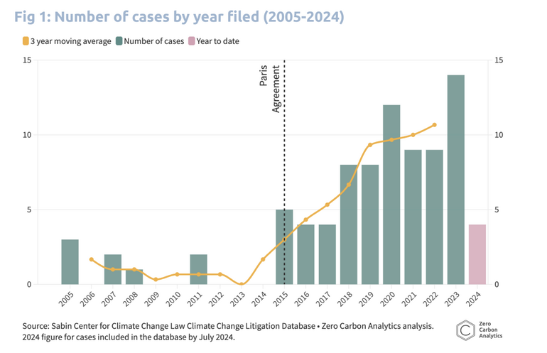 Segundo um estudo elaborado pela Oil Change International e pela Zero Carbon Analytics, 86 processos climáticos foram ajuizados contra as maiores corporações produtoras de petróleo, gás e carvão do mundo – incluindo BP, Chevron, Eni, ExxonMobil, Shell e TotalEnergies – sendo que dois em cada cinco casos envolvem reivindicações por compensação por danos climáticos relacionados aos combustíveis fósseis. O número de casos ajuizados contra empresas de combustíveis fósseis a cada ano quase triplicou desde a adoção do Acordo de Paris em 2015. A análise revela a crescente pressão legal sobre as corporações de combustíveis fósseis, responsáveis por 69% das emissões de dióxido de carbono causadas pelo homem, o principal motor da crise climática. Este relatório intitulado "Big Oil in Court é a primeira análise aprofundada da onda crescente de litígios climáticos direcionados aos gigantes dos combustíveis fósseis.