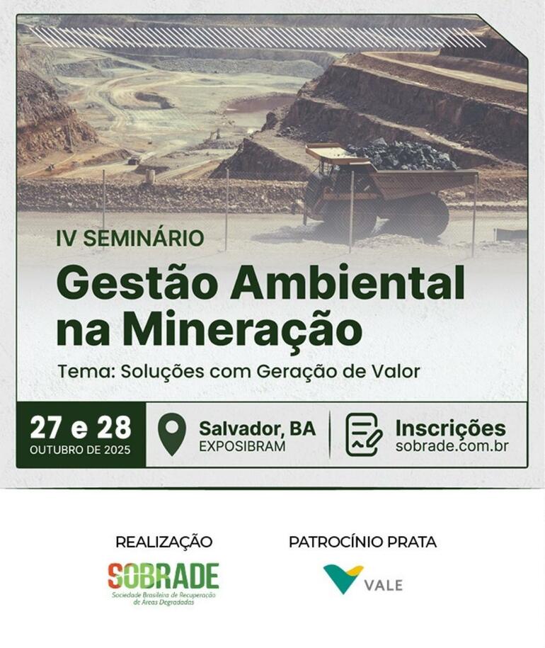 A Sociedade Brasileira de Recuperação de Áreas Degradadas (Sobrade) promove o IV Seminário de Gestão Ambiental na Mineração nos próximos 27 e 28 de outubro, no Centro de Convenções Salvador, na Bahia. O evento trará como tema central “Soluções com geração de valor”, e reunirá pesquisadores, profissionais do setor, empresas e estudantes para debater práticas inovadoras e sustentáveis na gestão ambiental.
