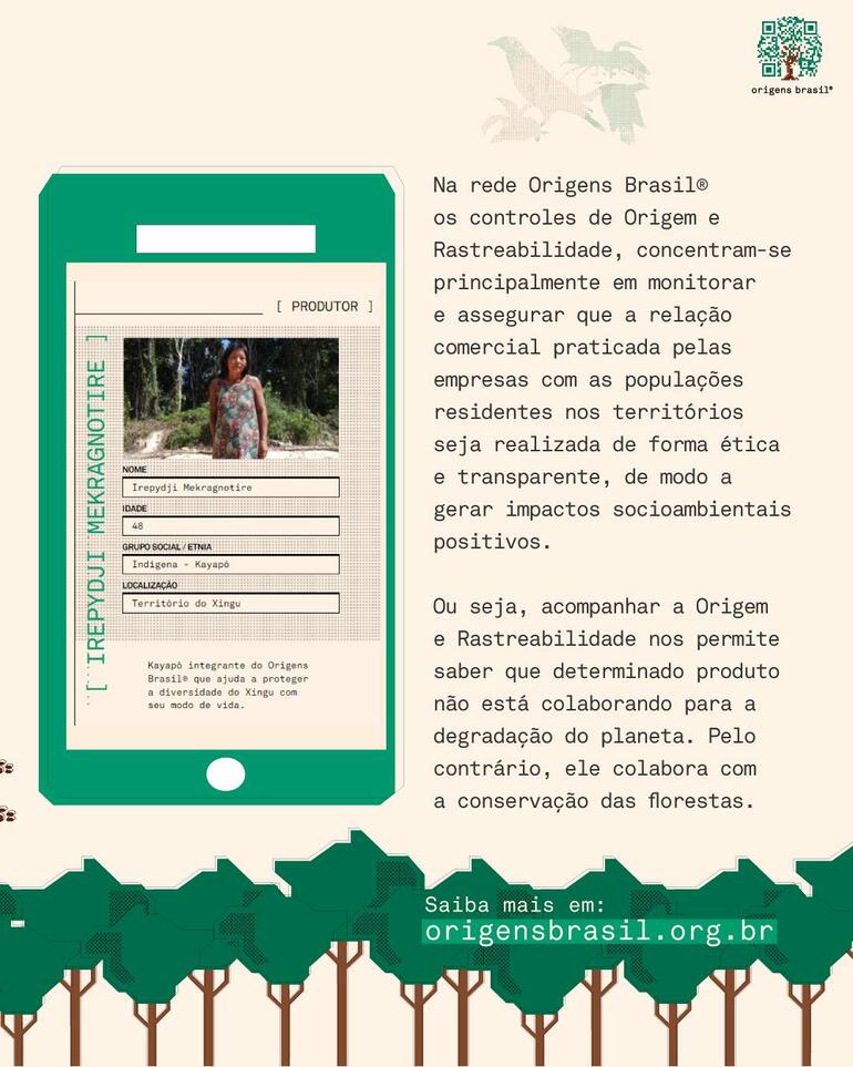 As empresas que fazem parte da rede acessam o mesmo sistema onde os dados primários foram inseridos pelos produtores. Para elas, a plataforma exibe análises mais completas, com um dashboard que permite que elas tenham mais previsibilidade e façam uma melhor gestão de suas compras. “Dessa forma, os dados de comercialização - quais os produtos vendidos, de quem e para quem, por qual valor e em que data - ficam registrados na plataforma de forma segura e transparente. Esse movimento garante mais segurança para as marcas compradoras”, reforça Mariana. Já os consumidores com acesso à tecnologia podem consultar dados sobre os povos produtores a partir do QR Code com numeração exclusiva, ou diretamente no site origensbrasil.org.br. Dessa maneira, é possível informar as pessoas sobre o território e as histórias por trás de cada produto, bem como dar visibilidade aos serviços socioambientais dos povos tradicionais, selando o compromisso com a transparência de ponta a ponta.
