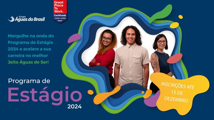 O Grupo Águas do Brasil lançou o Programa de Estágio 2024 e recebe inscrições até 15 de dezembro. As oportunidades estão disponíveis para as concessões de Minas Gerais, Rio de Janeiro e São Paulo. As 43 vagas disponibilizadas para a nova turma do Programa de Estágio são nas áreas de Administração; Arquitetura, Biologia, Biomedicina, Ciência da Computação; Ciências Atuariais; Ciências Biológicas, Ciências Contábeis; Comunicação; Contabilidade; Desenvolvimento de Sistemas; Economia; Engenharia Ambiental; Engenharia Civil; Engenharia de Automação; Engenharia de Produção; Engenharia Eletrônica; Engenharia Elétrica; Engenharia Eletrotécnica; Engenharia Mecânica; Engenharia de Recursos Hídricos, Engenharia Sanitária; Estatística; Geologia; Gestão Ambiental; Gestão de Produção Industrial; Gestão de RH, Jornalismo; Logística; Marketing; Mecatrônica; Química; Psicologia; Sistemas da Informação; Técnico em Gestão Ambiental; Técnico em Química; Técnico em Meio Ambiente; Técnico Segurança do Trabalho.