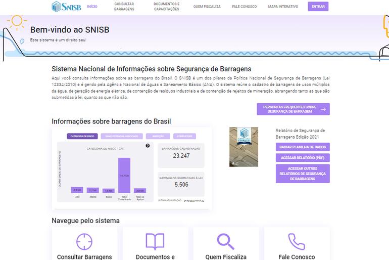 A Agência Nacional de Águas e Saneamento Básico (ANA) lançou, dia 4 de outubro, o novo Sistema Nacional de Informações sobre Segurança de Barragens (SNISB). O material foi remodelado para facilitar o acesso e dar transparência às informações disponíveis sobre mais de 23 mil barragens cadastradas. Os interessados podem consultar no www.snisb.gov.br.