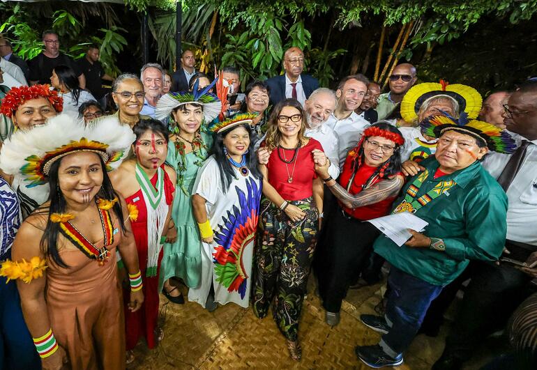Na declaração sobre bioeconomia, Macron e Lula reafirmaram a importância do combate ao desmatamento, priorizar a restauração de ecossistemas degradados, proteger a biodiversidade e incluir mulheres, povos indígenas e comunidades locais na tomada de decisões. O documento reforça o apoio à criação do fundo Florestas Tropicais para Sempre, proposta apresentada pelo Brasil na COP28, em Dubai, no fim de 2023. "Vamos também relançar atividades de cooperação e a luta contra o garimpo ilegal e a luta contra todos os interesses financeiros de curto prazo que venham aqui ameaçar a floresta. O que queremos fazer é preservar, conhecer melhor, multiplicar a cooperação científica, construir estratégias de apoio aos povos indígenas e, juntos, realizar ações de investimentos em bioeconomia para que isso aumente", afirmou Macron no encontro com lideranças indígenas. Após reunião bilateral e visita à Ilha do Combu, os presidentes participaram de encontro com lideranças indígenas. O cacique Raoni Metuktire foi condecorado por Macron com a Ordem Nacional da Legião de Honra, principal honraria da França. “Nunca você parou. Nunca você vai parar. Você foi um líder desse combate e levou muito mais longe, de maneira mais firme, do que muitos outros. Você é um cacique cuja idade já não conta. A sua energia é cada vez mais forte. Cada vez que o vejo ele está mais forte. Lula, ele é uma esperança para nós”, afirmou o presidente francês. A comitiva teve a presença das ministras Marina Silva (Meio Ambiente e Mudança do Clima), Sonia Guajajara (Povos Indígenas) e o ministro Mauro Vieira (Relações Exteriores). A delegação também incluiu a primeira-dama Janja Lula da Silva, a presidente da Funai, Joenia Wapichana e o governador do Pará, Helder Barbalho, entre outros.