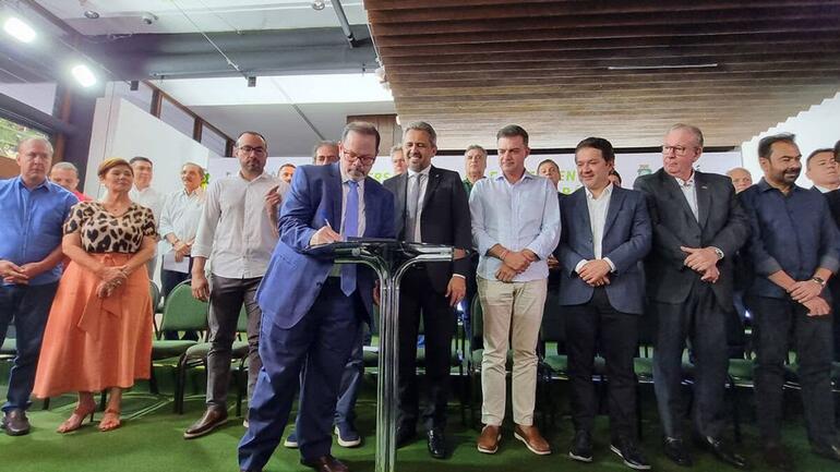 O governador do Ceará, Elmano de Freitas, o presidente da Companhia de Água e Esgoto do Estado do Ceará, a Cagece, Neuri Freitas e Renato Medicis, vice-presidente da Aegea no Norte e Nordeste assinaram contrato de Parceria Público-Privada (PPP) que prevê a prestação de serviços de saneamento em 17 municípios nas Regiões Metropolitanas de Fortaleza e do Cariri, pertencentes ao Bloco 1.
