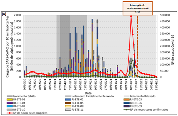 Nas semanas epidemiológicas 14 (de 3 a 9 de abril) a 17 (de 24 a 30 de abril), a Rede Monitoramento COVID Esgotos observou a permanência de baixas cargas do novo coronavírus (SARS-CoV-2) nos esgotos do município do Rio de Janeiro. Nesse período a maior carga foi de 0,9 bilhão de cópias do vírus por dia para cada 10 mil habitantes, registrada na semana 15 (de 10 a 16 de abril). Na semana 16 (de 17 a 23 de abril) a carga caiu para o menor valor das últimas quatro semanas de monitoramento: 0,1 bilhão de cópias por dia para cada 10 mil habitantes. Nos pontos monitorados na capital fluminense, entre as semanas 14 e 17, houve dois tipos de situação: ou o vírus não foi detectado ou teve baixas concentrações (entre 1 e 4 mil cópias por litro das amostras). Especificamente na semana 17, após o Carnaval, todos os pontos monitorados tiveram registro da presença do vírus – mesmo com baixas concentrações – o que não acontecia desde a semana epidemiológica 3 (de 16 a 22 de janeiro).