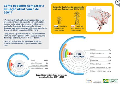 A cartilha compara também a matriz elétrica e a evolução das linhas de transmissão instaladas no Brasil, que duplicou de extensão entre 2001 e 2020.