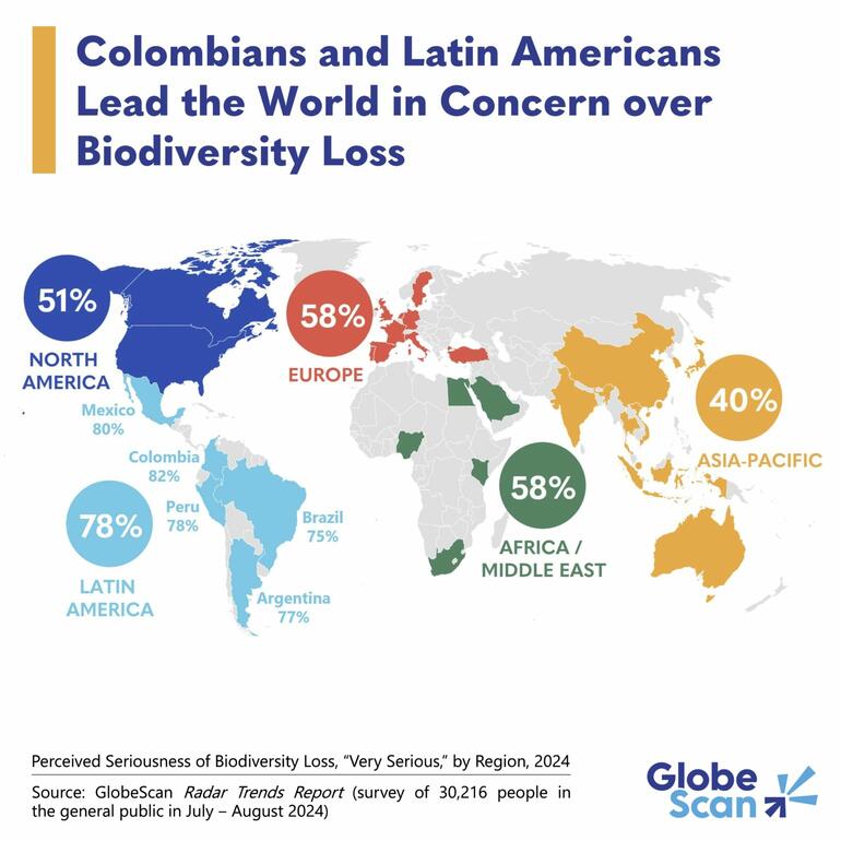 Segundo levantamento do Radar Trends Report, da GlobeScan, junto a 30.216 pessoas nos meses de julho e agosto de 2024, 78% dos moradores da América Latina são preocupados com a perda de biodiversidade. Desse total, os colombianos demonstram uma maior preocupação, com 82%, seguidos pelos peruanos, com 78%, Argentina e Brasil, com 77% e 75%, respectivamente. No momento, líderes empresariais globais, formuladores de políticas e representantes da sociedade civil se reúnem em Cali, Colômbia (de 21 de outubro a 1º de novembro de 2024) para a Conferência das Nações Unidas sobre Biodiversidade de 2024 das Partes da Convenção das Nações Unidas sobre Diversidade Biológica (COP16). A Colômbia é um dos países com maior biodiversidade do mundo, onde o desmatamento e outras ameaças à sua biodiversidade estão associadas a aumentos n desigualdade social, conflitos aramados internos e tráfico ilegal de drogas, entre outros problemas. Assim como as mudanças climáticas, os resultados da pesquisa mostram que os mais vuilneráveis aos seus efeitos, tendem a se preocupar muito mais.