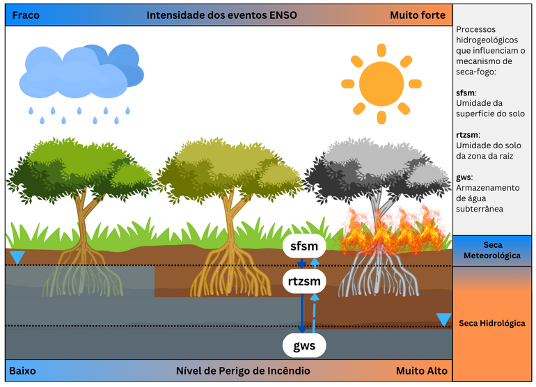 Para a caracterização da seca hidrológica, os pesquisadores utilizaram informações de satélite da missão GRACE, sigla em inglês para Gravity Recovery and Climate Experiment, que permite detectar o armazenamento de água terrestre integrando umidade do solo, água superficial e a subterrânea e cruzaram com dados sobre a gravidade da seca em cada local analisado. Com isso, conseguiram identificar áreas com menor concentração de umidade no nordeste da bacia amazônica, além de uma diminuição da umidade em direção ao leste. As maiores áreas queimadas coincidiram com regiões que enfrentaram seca durante eventos extremos do El Niño, com um aumento entre 2015 e 2016. À época, o fenômeno foi considerado um dos três mais intensos já registrados (juntamente com 1982/83 e 1997/98). O de 2023/2024 está entre os cinco mais fortes, segundo a Organização Meteorológica Mundial (WMO).