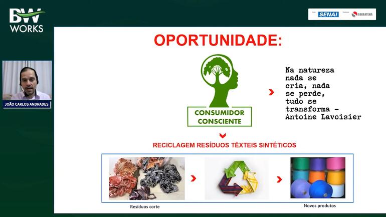 O BW Works SENAI – Empresas Inovadoras, uma iniciativa do Movimento BW, com o apoio do SENAI, transmitido no dia 31 de maio, com apresentação de Luís Gustavo Delmont, especialista em desenvolvimento industrial no SENAI Nacional, para debater os desafios da indústria têxtil em âmbito ambiental, já que cerca de 20% dos tecidos utilizados para a confecção de peças de vestuário se transformam em resíduos.