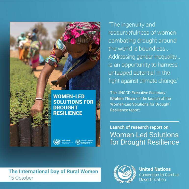 Segundo novo relatório da Convenção das Nações Unidas para o Combate à Desertificação (UNCCD) e da Organização das Nações Unidas para a Alimentação e a Agricultura (FAO), as mulheres e meninas enfrentam as maiores dificuldades provocadas pela estiagem, mas, ao mesmo tempo, são as que mais contribuem com o desenvolvimento de soluções para enfrentar tal aridez. Lançado por ocasião do Dia Internacional das Mulheres Rurais, o relatório intitulado Women-Led Solutions for Drought Resilience pede melhor reconhecimento e apoio aos esforços liderados por mulheres para proteger comunidades vulneráveis dos efeitos devastadores da seca. Ele também ressalta que os direitos das mulheres à terra são cruciais para alcançar a segurança alimentar. “As mulheres há muito são vistas como as mais vulneráveis à seca, mas, como este relatório revela, elas também são as mais resilientes, liderando o caminho no desenvolvimento de soluções para um dos desafios mais urgentes do mundo", disse Ibrahim Thiaw, Secretário Executivo da UNCCD. "A engenhosidade e a desenvoltura das mulheres que combatem a seca ao redor do mundo são ilimitadas. Seja na região do Sahel na África, no norte do Quênia, no Irã, no Peru ou no Marrocos, as mulheres provaram sua resiliência e sua capacidade de superar as condições mais caóticas para manter suas famílias prosperando. Abordar a desigualdade de gênero não é apenas uma questão de justiça — é uma oportunidade de aproveitar o potencial inexplorado na luta contra as mudanças climáticas”.