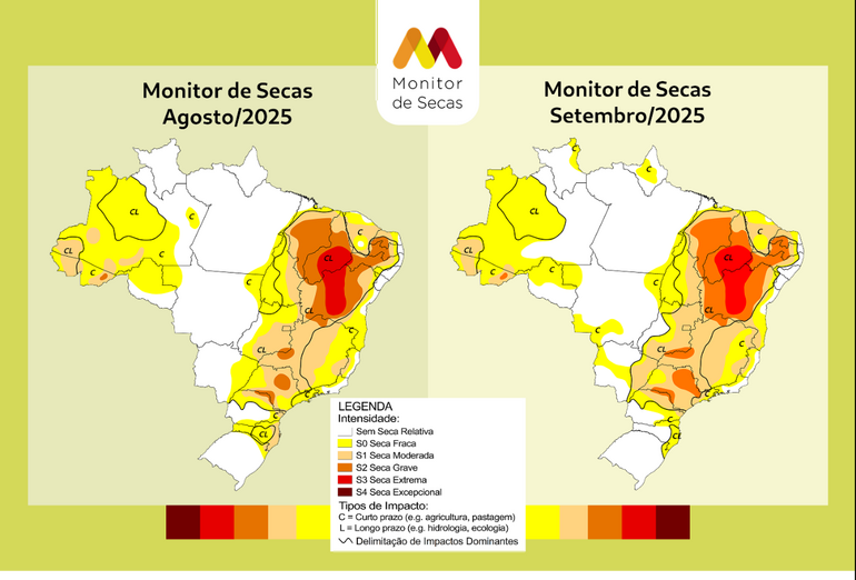 Na comparação entre agosto e setembro de 2025, quatro estados registraram aumento da área com seca: Ceará, Mato Grosso, Mato Grosso do Sul e Paraná; sendo que o Amapá e Roraima registraram o retorno do fenômeno. No sentido oposto, o Monitor identificou diminuição da área com seca em sete estados: Alagoas, Pernambuco, Goiás, Amazonas, Rondônia, Rio Grande do Sul e Santa Catarina. Em 14 unidades da Federação, a área com seca se manteve estável: Acre, Bahia, Distrito Federal, Espírito Santo, Maranhão, Minas Gerais, Pará, Paraíba, Piauí, Rio de Janeiro, Rio Grande do Norte, São Paulo, Sergipe e Tocantins. Seis unidades da Federação registraram seca em 100% do território em setembro de 2025: Piauí, Distrito Federal, Minas Gerais, São Paulo, Acre e Tocantins.Nos demais estados com registro do fenômeno, os percentuais variaram de 3% a 97%.Com base no território de cada unidade da Federação acompanhada, o Amazonas lidera a área total com seca de agosto, seguido por Minas Gerais, Bahia, Maranhão e Tocantins. No total, entre agosto e setembro, a área com o fenômeno se manteve estável no patamar de 4,8 milhões de km², o equivalente a 57% do território brasileiro.
