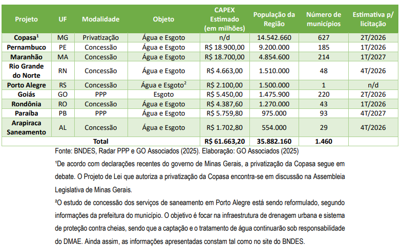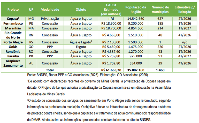 O Instituto Trata Brasil entende que a etapa de implementação do Marco Legal do Saneamento Básico tem nove projetos em fase avançada de estruturação, com expectativa de conclusão em 2026. No conjunto de projetos estruturados com o apoio do BNDES para os próximos anos, destaca-se a perspectiva de viabilização da licitação de projetos de saneamento, especialmente em estados com baixos índices de cobertura dos serviços prestados.