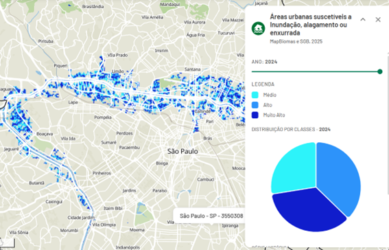 Um levantamento realizado pela Plataforma Natureza ON, um serviço gratuito lançado recentemente pela Fundação Grupo Boticário, em parceria com o MapBiomas com tecnologia Google Cloud, mostrou que aproximadamente 2% do território do município de São Paulo, o equivalente a 3.075,67 hectares, estão em áreas com risco de inundação, alagamento ou enxurrada. A área suscetível aos efeitos dos temporais corresponde a 20 parques do Ibirapuera.