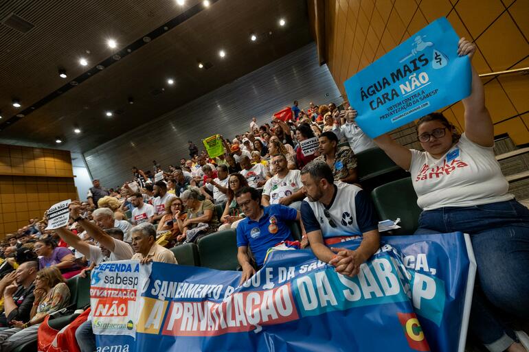 Do lado oposto, os servidores do Sindicato dos Trabalhadores em Água, Esgoto e Meio Ambiente do Estado defenderam na tribuna a função social da Sabesp, além de questionar as justificativas apresentadas no projeto do Governo. "O principal objetivo de ter uma empresa de saneamento como a Sabesp é levar saúde para a população", afirmou o presidente do Sintaema, José Faggian. "A parte da população vulnerável hoje no cadastro da Sabesp é de 7,5% dos domicílios. Significa que 92,5% da estrutura do Estado não vai ter benefício nenhum", completou o conselheiro da Sabesp, Ronaldo Coppa. Outra preocupação da oposição é o controle da Sabesp passar para a iniciativa privada. "A Sabesp tem, sim, recurso e projeto para ampliar sua atuação e sua performance operacional. Com a desestatização, a presença do Estado na Sabesp será frouxa, não influenciará em dividendos e nem na tarifa", afirmou Amauri Pollachi, também membro do sindicato.