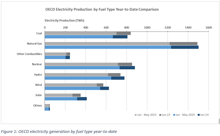 Na Organização para Cooperação e Desenvolvimento Econômico (OCDE), em junho de 2024, a produção líquida total de eletricidade atingiu 902,8 TWh, um aumento de 5,4% em comparação com o mesmo mês do ano passado. Em uma base anual, a produção líquida total de eletricidade cresceu em 2,9% nos dois primeiros trimestres de 2024. A geração de eletricidade a partir de combustíveis fósseis totalizou 422,7 TWh em junho de 2024, uma queda de 0,6% em comparação com junho de 2023. A OCDE Europa testemunhou a maior redução para combustíveis fósseis (-12,9% a/a), impulsionada pela menor geração de gás natural (-21,0% a/a), enquanto a OCDE Ásia-Oceania viu um declínio de -3,0% a/a. Já a OCDE Américas testemunhou um aumento na produção de eletricidade a partir de combustíveis fósseis (+3,8% a/a), impulsionada tanto pelo carvão (+4,5% a/a) quanto pelo gás natural (+3,2% a/a). No geral, os combustíveis fósseis foram responsáveis por 46,8% do mix de eletricidade da OCDE.