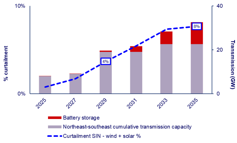 Somente a implantação de sistemas de armazenamento em baterias, aliada à expansão da transmissão a partir da década de 2030, poderá conter o crescimento dos cortes, observa o relatório. A partir de 2032, a expansão do fornecimento de baterias, aliada a avanços tecnológicos que permitam maior duração do armazenamento, será crucial para estabilizar os níveis de corte. "Acréscimos na capacidade de transmissão por si só não resolverão o problema de escalabilidade da restrição", disse Fernando Dorand, analista de energia da Wood Mackenzie. "Medidas de resposta à demanda e baterias ajudarão a absorver o excesso de oferta de energia do Nordeste. As baterias permitirão que os geradores convertam essa energia desperdiçada em oportunidades de arbitragem de energia e revertam as perdas de lucro que enfrentam." No entanto, o apoio regulatório ainda é necessário. Os altos custos de capital significam que essa tecnologia ainda requer incentivos regulatórios, como o leilão planejado com foco em armazenamento. Qualquer adiamento deste leilão ameaça as previsões de implantação de baterias e aumentaria ainda mais os riscos de restrição.